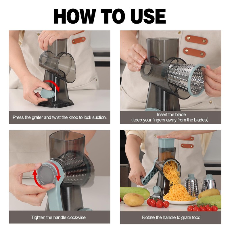 - Easy Operation Cheese Grater: the cheese slicer with strong suction base keep the cheese grater stable on clean and smooth surface, makes the grating easier; The pieces cut by vegetable slicer will fall off from the transparent barrel, no blockage