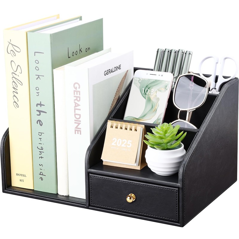 GORESE PU Leather Desk Organizer, File Organizer with Drawer and 4 Compartments, Desktop Organization with Magazine file Holder for Office Supplies, Elegant Gift for Men Who Have Everything, Black