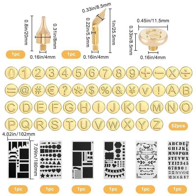 Wood Burning Set: Includes 52pcs wood burning tool head(contains 26pcs A-Z uppercase alphabet, 10pcs 0-9 numbers, 5pcs mathematical symbol, 8pcs special symbol and 3pcs currency symbols), 4pcs hot stamps iron tips and 6pcs drawing stencils. Burning tool head about 12x9mm, pin: 4mm; pen tips are 28x7.5x4mm and 20x8mm; stencils size: 178x102x0.3mm. You can use them to unique text or add fun patterns to any project.
