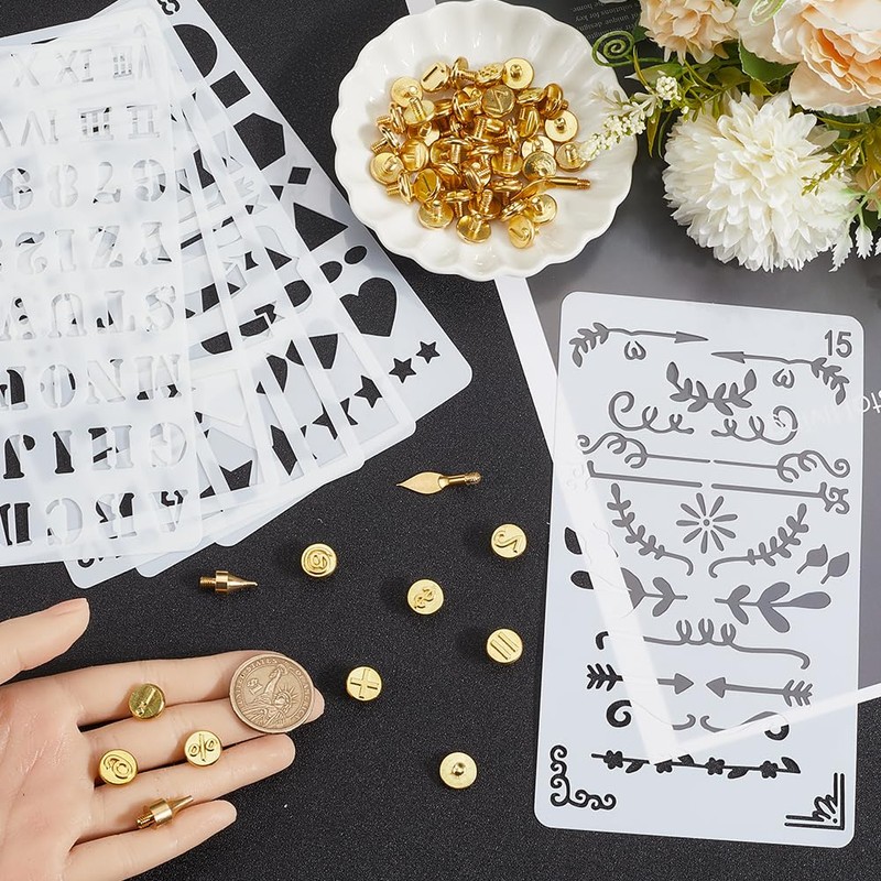 GORGECRAFT 56Pcs Wood Burning Tip Gold Letter Number Brass Head Hot Stamps Tips Kit Alphabet Number Symbol Pyrography Head with 6 Styles Plastic Journal Painting Stencil for Wood DIY Embossing Carving