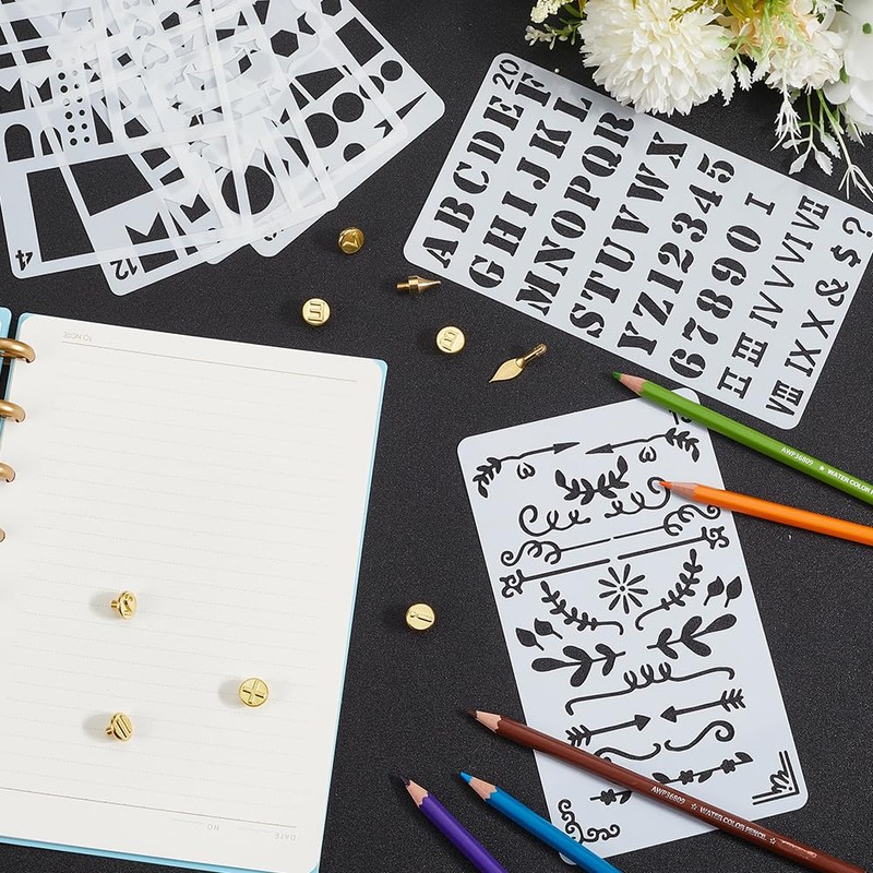 6 Styles Templates: 6Pcs drawing stencils with different patterns, contains star, heart, round, geometric patterns, dialogs, vine borders, letters, journal, etc., which make it easy to DIY scrapbooking