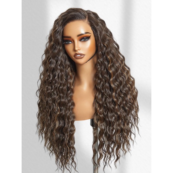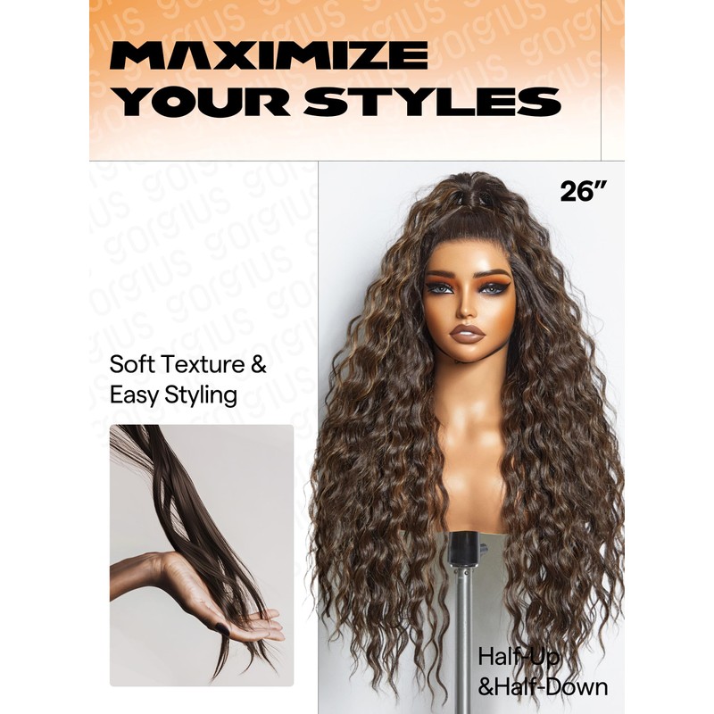 GORGIUS Brown Highlight Ocean Wave Lace Front Wigs Pre Cut Glueless Side Part Closure Wig 28 Inch Synthetic Long Wig