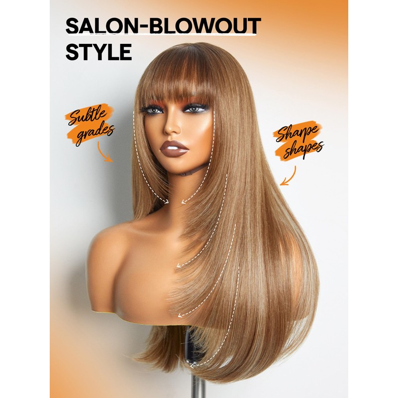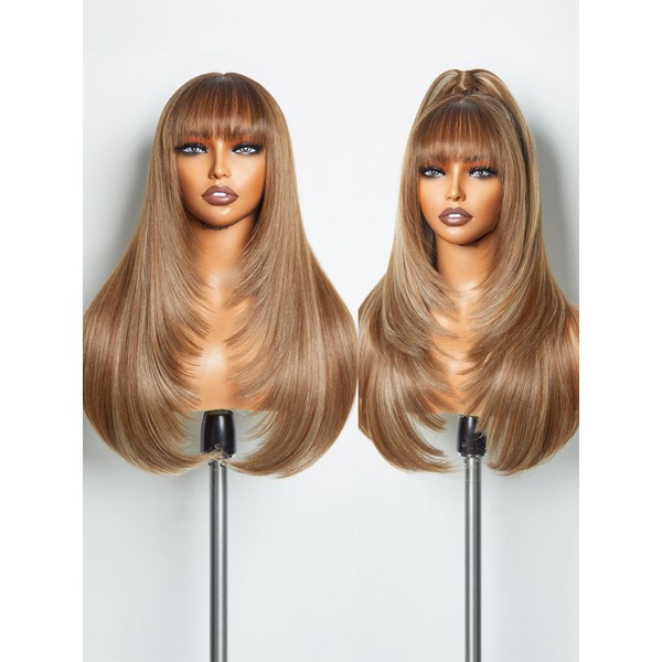 - PUT ON & GO: Beginner-friendly. This 22 inch glueless highlight straight layered wig with bangs requires no expertise for installation, easy to manage