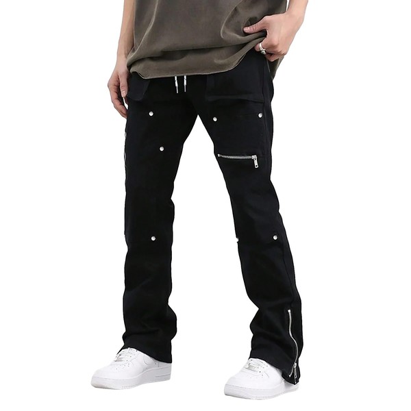 GORGLITTER Men's Baggy Zipper Hem Flared Cargo Pants Elastic Waist Rivets Stacked Trousers with Pockets Black Large