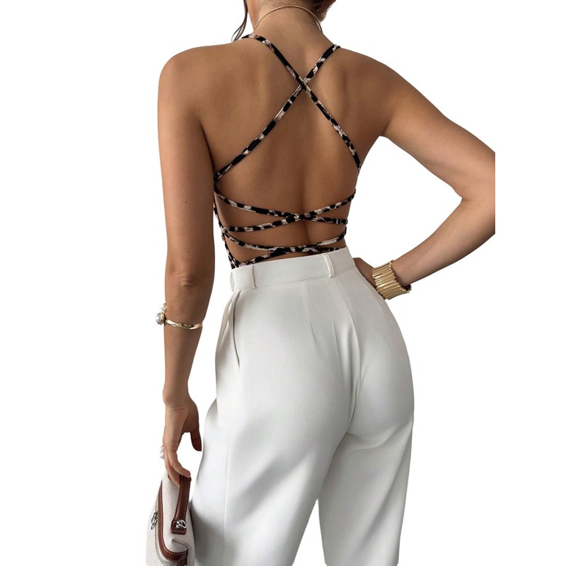 - Cross strap / casual / camisole / backless / leopard print bodysuit for women