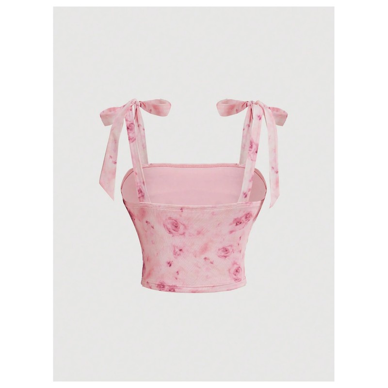- Sleeveless, ruched, tie shoulder, square neck, floral print, slim fit, crop mesh tank top for women, show your charming