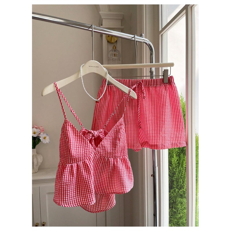GORGLITTER Women's Gingham Shorts Sets Bow Tie Ruffle Cami Top Drawstring Shorts Summer Matching Outfits Red Small