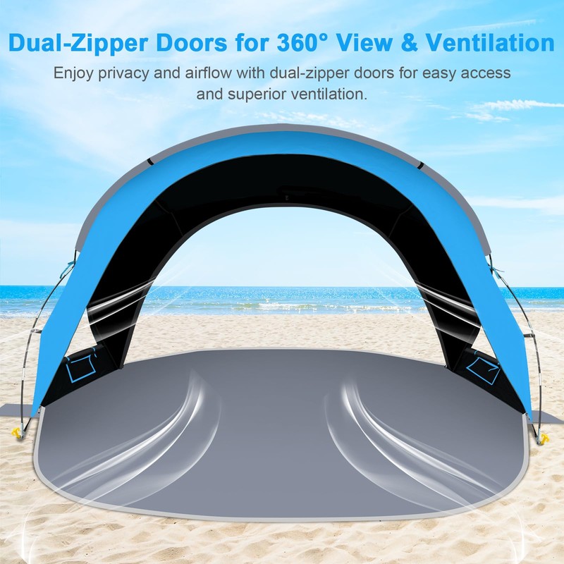- Enhanced Visibility & Ventilation with 2 Doors: This tent features dual zippered doors and 2 mesh windows, providing 360° panoramic views and superior airflow from all four sides, keeping you cool and comfortable. The pull-down doors act as 2 extension floors, creating more sand-free space for beach play. When you need privacy, simply zip them up for a cozy, enclosed space