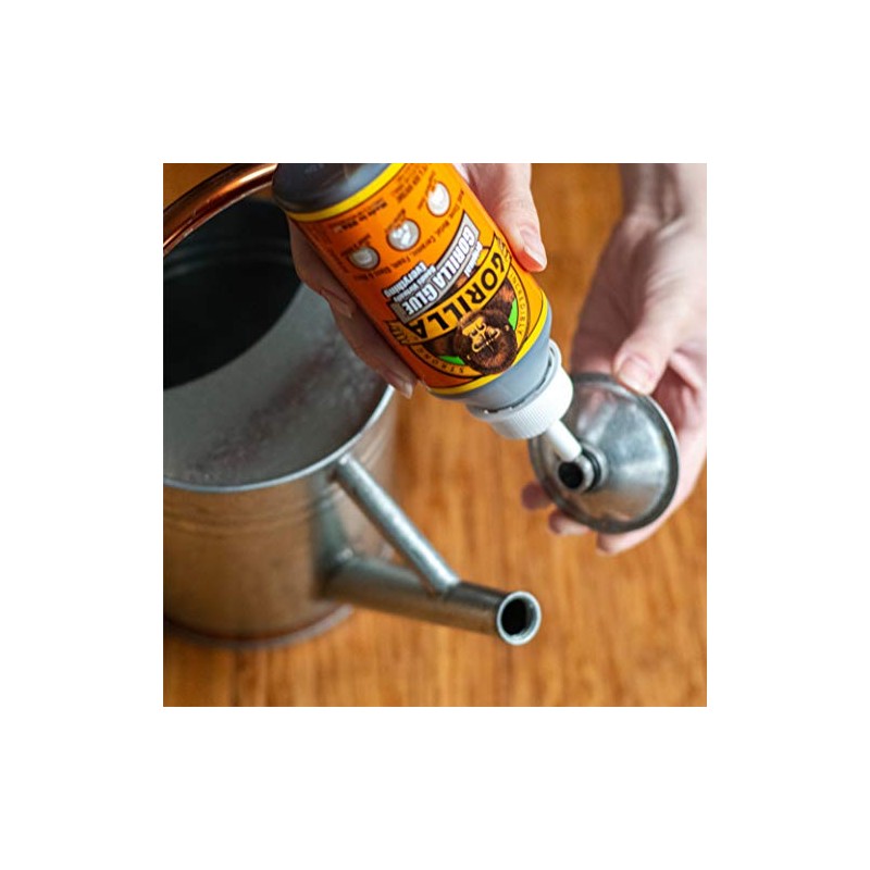 Gorilla Glue cures with exposure to moisture in the wood and atmosphere; it is stainable and self-spreading. It bonds exotic and common woods, as well as ceramics, plastic, metals, stone, and much more. 100% waterproof, solvent-free, and environmentally friendly. 8-ounce bottle.