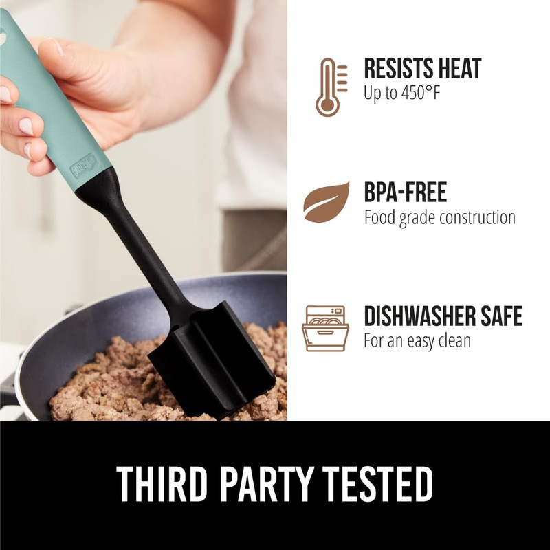 - ERGONOMIC, SLIP RESISTANT GRIP HANDLE: break up ground meat easier than ever before; ergonomic handle is constructed from soft touch rubber and is slip resistant for a steady hold