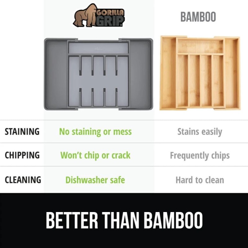 • HEAVY-DUTY CONSTRUCTION BETTER THAN BAMBOO: unlike other brands made of bamboo our silverware organizer is constructed with durable and thick, plastic that will not warp; material is easy to clean and will not stain, dishwasher safe for an easy clean