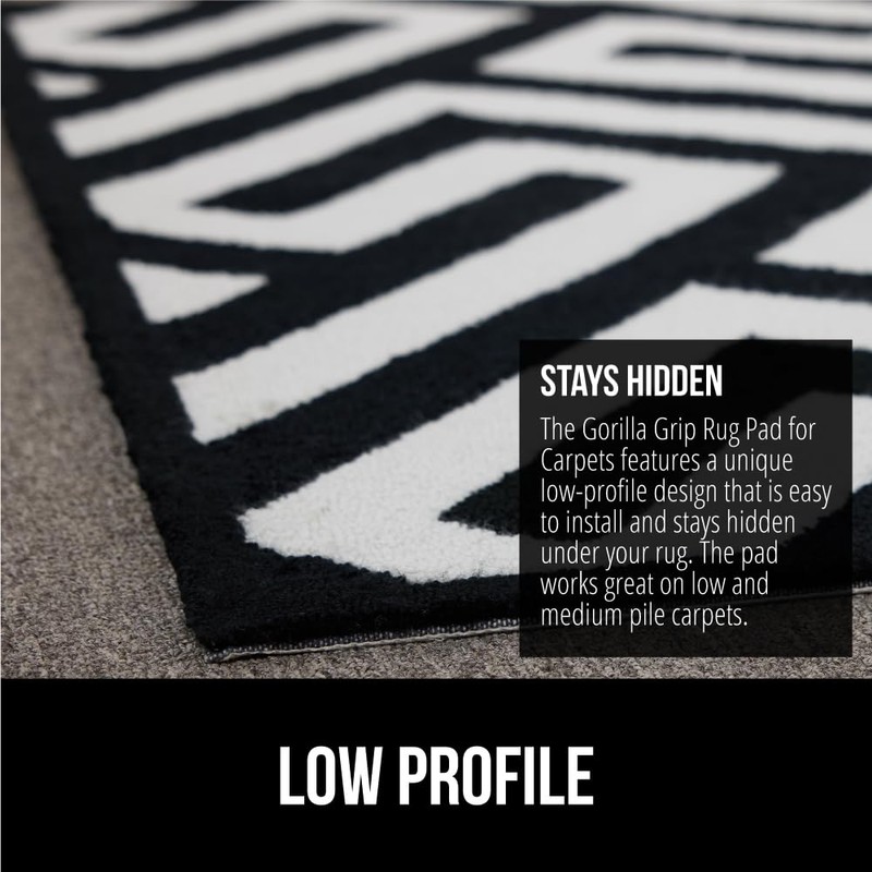 - LOW PROFILE DESIGN: pad's low profile design stays hidden under rugs and will not leave behind residue or stain your carpet; helps to lock rug in place on wall to wall carpet