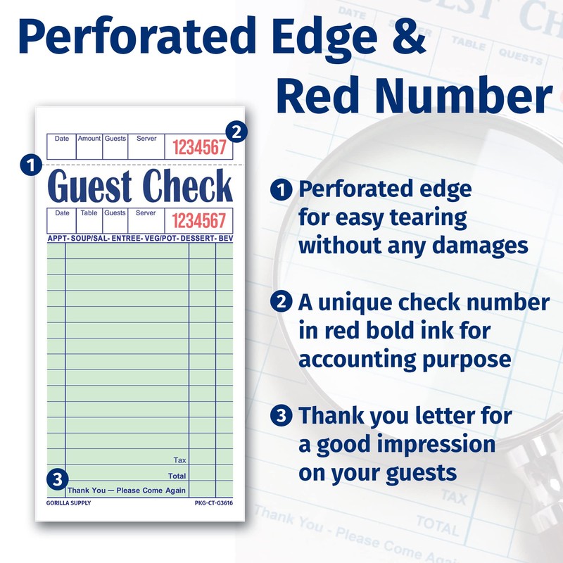 - PERFORATED EDGE: Perforated edges at the top for easy tearing without damaging any information and a unique check number in bold red ink for accounting. By a THANK YOU letter at the bottom, you can leave a good impression on your guests.