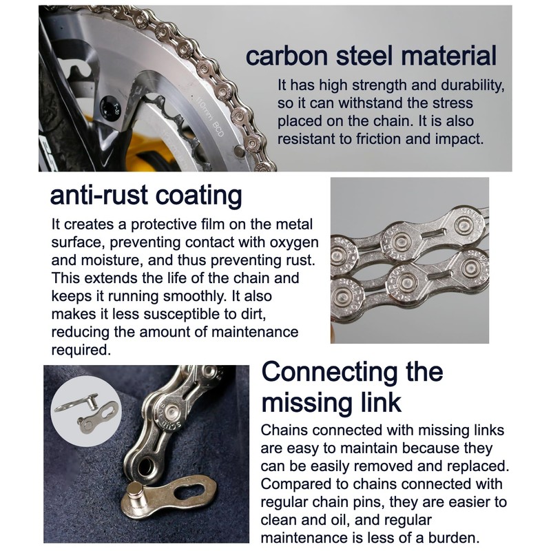 - [Connected with missing links] Chains connected with missing links are easy to remove and replace, making maintenance easy. Compared to connecting with normal chain pins, the advantage is that they are easier to clean and lubricate, and regular maintenance is less of a burden.