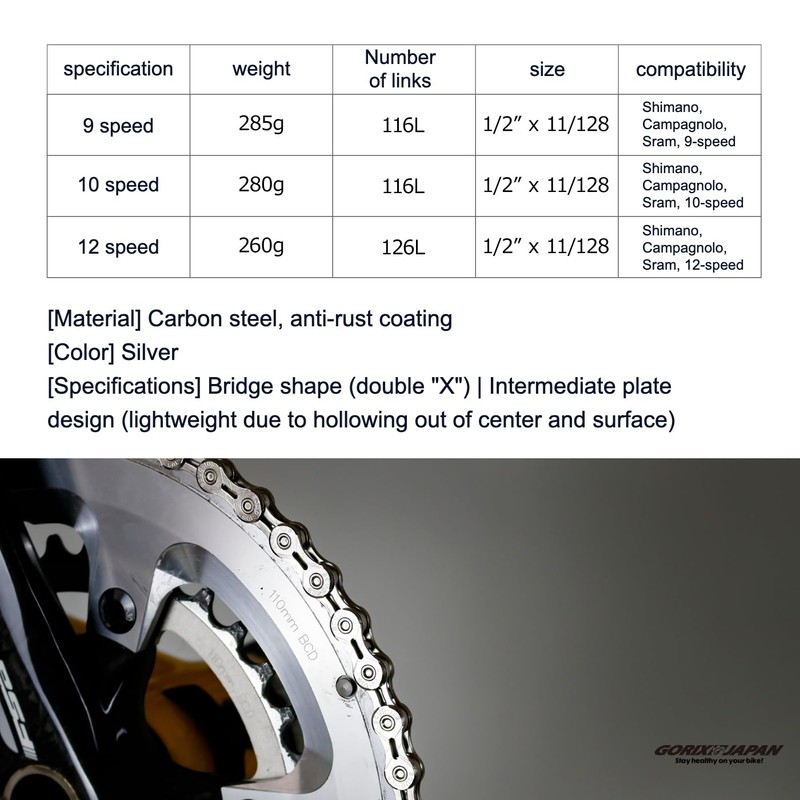 - Size: 1/2” x 11/128 Links: 116 links | 126 links (12-speed) Weight: 285g (9-speed) | 280g (10-speed) | 260g (12-speed) Compatible with: Shimano, Campagnolo, Sram Material: Carbon steel, anti-rust coating Color: Silver Specifications: Bridge shape (double “X”) | Hollow plate design (lightweight due to hollowing out of center and surface)