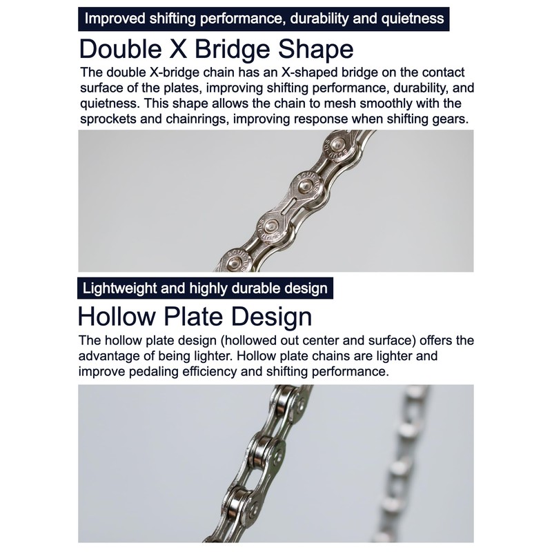 - [Double X-bridge shape] A double X-bridge shape chain has an X-shaped bridge on the contact surface of the plate to improve shifting performance, durability, and quietness. This shape allows the chain to mesh smoothly with the sprocket and chain ring, improving response when shifting. In addition, the bridge structure strengthens rigidity, suppresses power loss when pedaling, and improves durability. In addition, uniform friction on the contact surface reduces chain noise, allowing for a quiet and comfortable ride.
