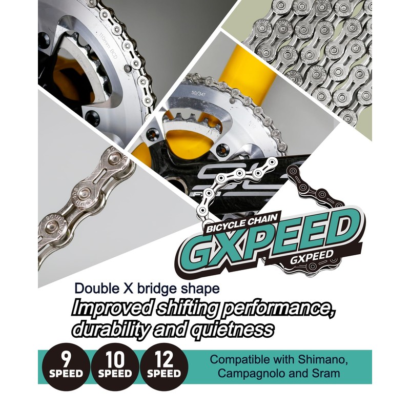 - ●9-speed/10-speed/12-speed ●Anti-rust coating effectively prevents rust ●Lightweight due to hollowing out of center and surface ●Double X bridge shape improves shifting performance, durability, and quietness ●Excellent wear resistance and cleanability ●Open structure inner and outer plate design improves weight and dirt discharge ●Easy to connect missing links ●Compatible with Shimano, Campagnolo, Sram