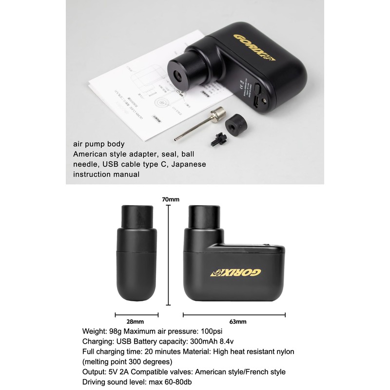 - [Product contents]: Electric mini air pump, [Size]: Length 63 x Width 28 x Height 70 mm [Weight]: 98g [Maximum air pressure]: 100psi [Charging]: USB type-c [Full charging time]: 20 minutes [Material]: Nylon [Compatible valves]: American type/Presbyterian type [Driving sound level]: Max. 60-80db