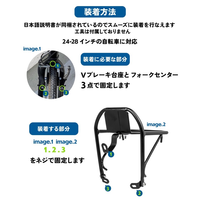- (Product Details) Front carrier, Japanese instruction manual. Bed size: Length 9.4 inches (24 cm) x Width 5.9 inches (15 cm) x Height up to 7.9 inches (20 cm). Material: Aluminum alloy. Maximum load: Approx. 19.8 lbs (9 kg). Compatible bicycle type: V-brakes, 24-28 inches bicycles. )