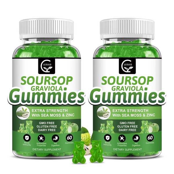 GORNVB (2 Pack) Soursop Graviola Gummies - 2200mg Extra Strength Soursop Leaves Extract w/Sea Moss Extract 200mg, Zinc & Vitamin C - Supports Immunity, Liver & Digestive, Gluten Free, Vegan, 120 Gummies