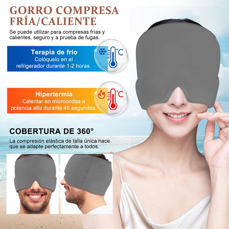 - Terapia de Frío y Calor: Gorro migraña crioterapia y compresión, proporcionando alivio natural para dolores de cabeza, tensión y dolor muscular. Ofrece enfriamiento instantáneo y relajación, reduciendo el estrés. También se puede calentar en el microondas para un efecto de calor terapéutico, ideal para migrañas.