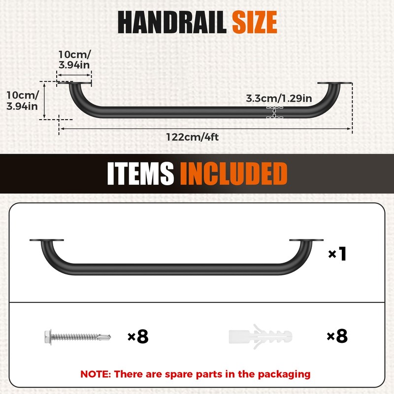 - Easy to Install: Wall mounted handrail kit includes all necessary screws for quick and easy installation on wood, concrete, vinyl, brick, or stucco surfaces. One-person DIY installation. (Note: Please measure the required length of the grab bar carefully before installation.)