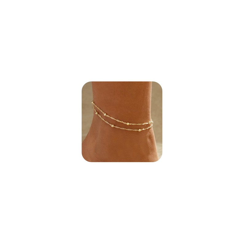 GOSFRY 2 PCS Gold Anklets for Women Waterproof Beaded Anklet Stackable Bracelets 14K Gold Plated Custom Jewelry Gifts Non Tarnish Lightweight 01