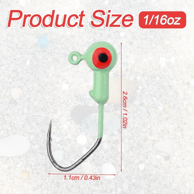 - Realistic & Glow in the Dark: Each jig head features lifelike 3D eyes and glows in the dark to enhance visibility and attract more fish, increasing your chances of a successful catch.