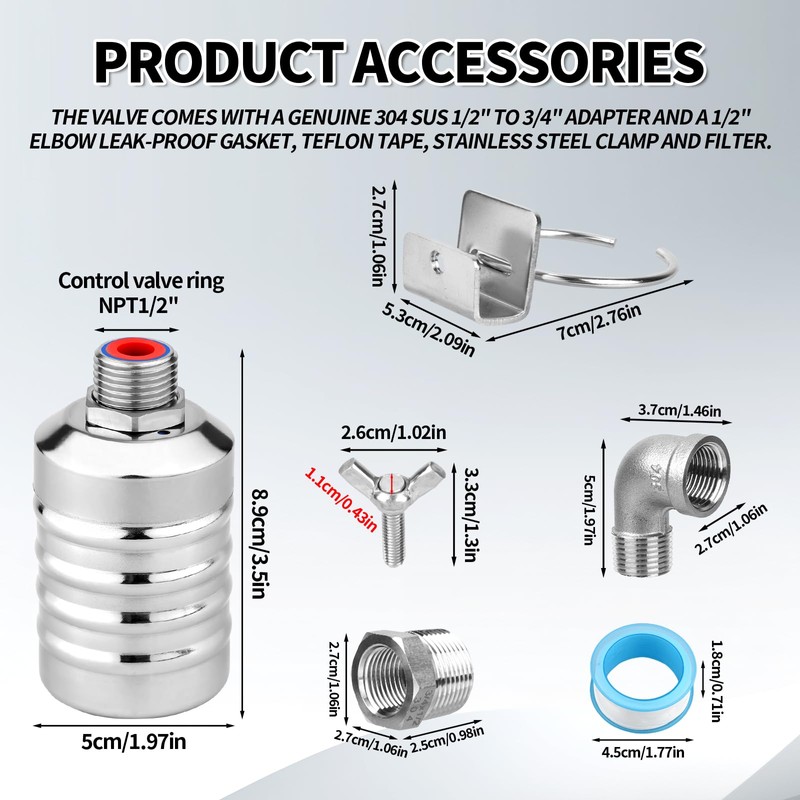 - Package includes: you will receive 1 piece water float valves, with 1 fixed clip, 1 core bushing, 1 side water inlet, 1 screws and 1 raw band.The complete set can meet your use and installation requirements.