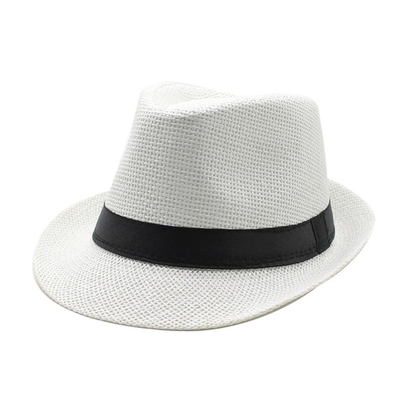Gossifan Straw Fedora Hat for Men Panama Hat Short Brim Summer Sun Hat, Black Belt-white, Medium