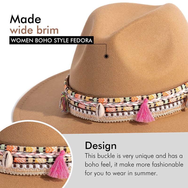 Gossifan Women's Felt Fedora Hat Wide Brim Panama Hats with Tassel-Camel