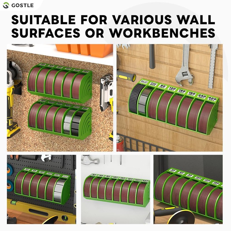 gostle 6 Inch Sanding Disc Storage Box, Sandpaper Organizer with 8 Bins – Space-Saving Storage Rack, Offset Snap-On Connection, Grit Classification, Efficient Organization, Green