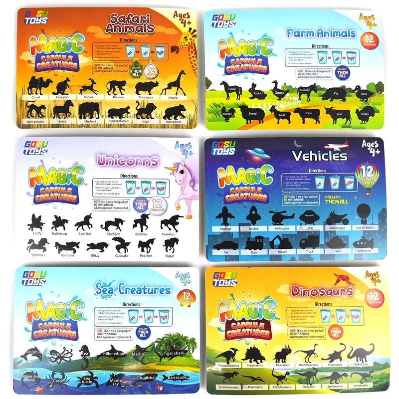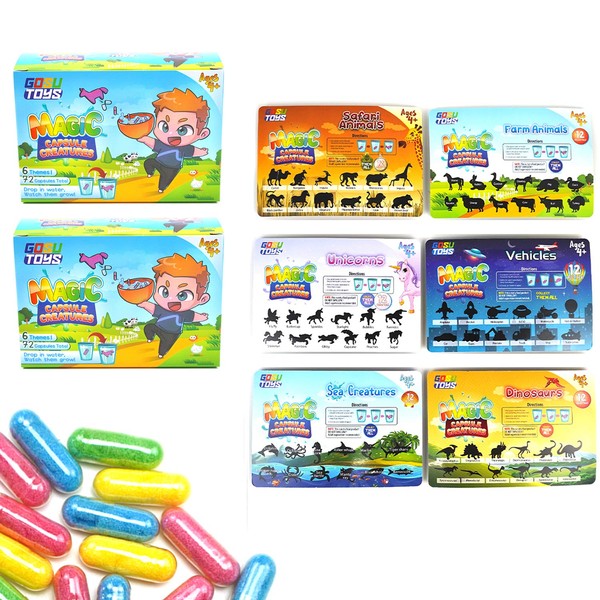 Gosu Toys Magic Capsule Creatures - 6 Theme Packs with 12 Capsules Each - Farm, Sea, Unicorns, Dinosaurs, Safari, Vehicles - Place in Water and Watch Them Grow (12 Pack (2 of Each Theme))