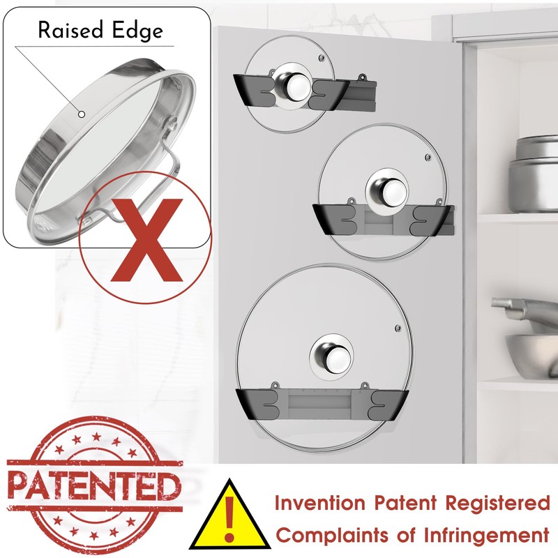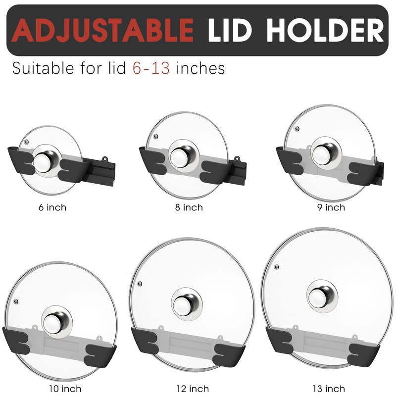 Gosuny Adjustable Universal Pot Lid Holder Organizer for Cabinet - Upgraded Patented 3 Pc Pan Lids Organizers Inside Door Wall Mount Pots Top Rack for Kitchen Cupboard Fit 6" to 13" (Black)