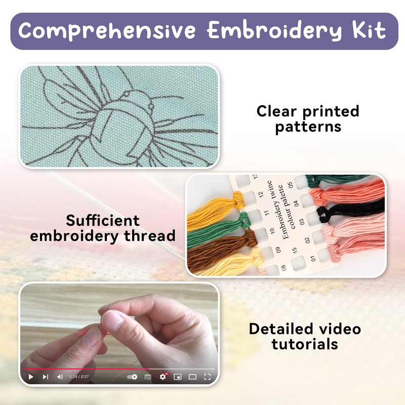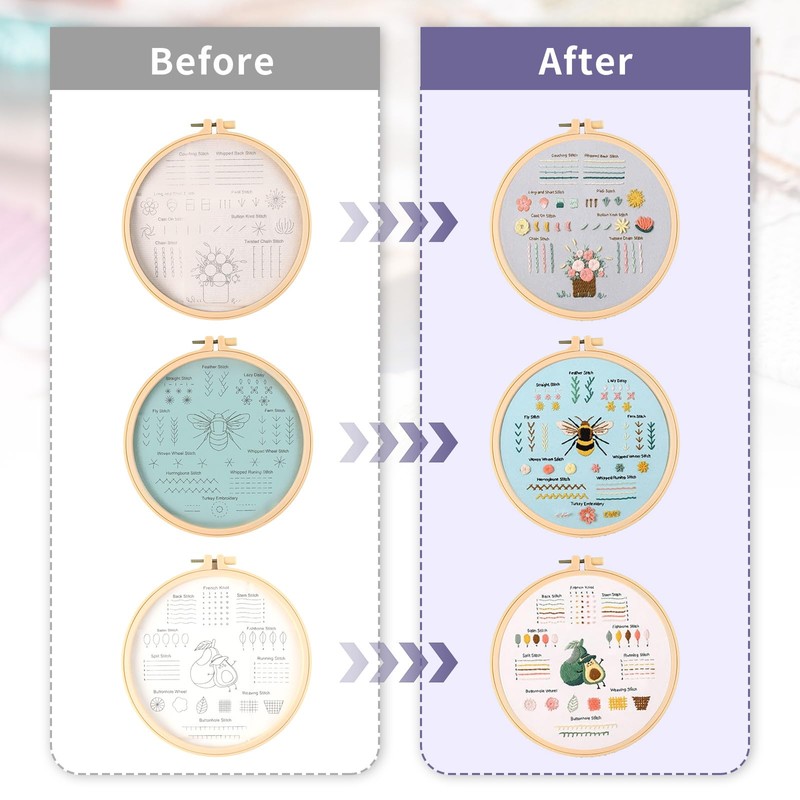 - 【Comprehensive Embroidery Tool Kit】This beginners embroidery kit includes all the essential accessories, such as 1 bamboo embroidery hoop, 3 fabrics with different patterns, colourful threads, embroidery needles, and tools, making it easy for you to get started.