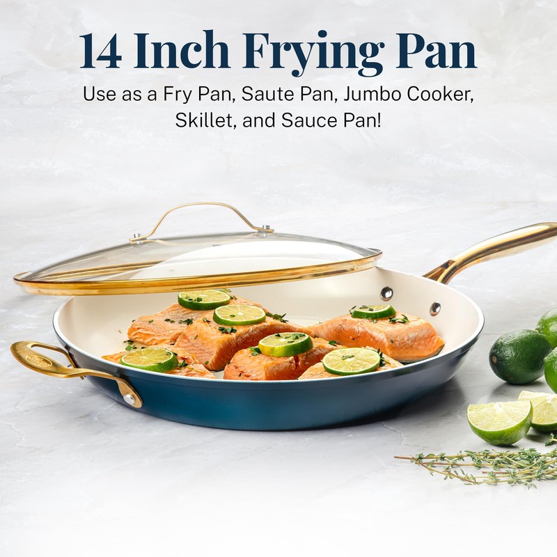 - 14 INCH FRYING PAN: Nonstick ceramic coating with even heat distribution to cook eggs, sear scallops, stir fry veggies, and more!