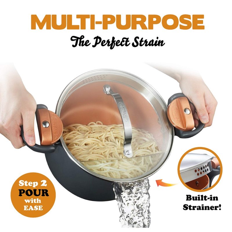 Gotham Steel 5 Quart Multipurpose Pasta Pot with Strainer Lid & Twist and Lock Handles Nonstick Copper Surface Oven/Dishwasher Safe Tempered Glass Lid, Graphite