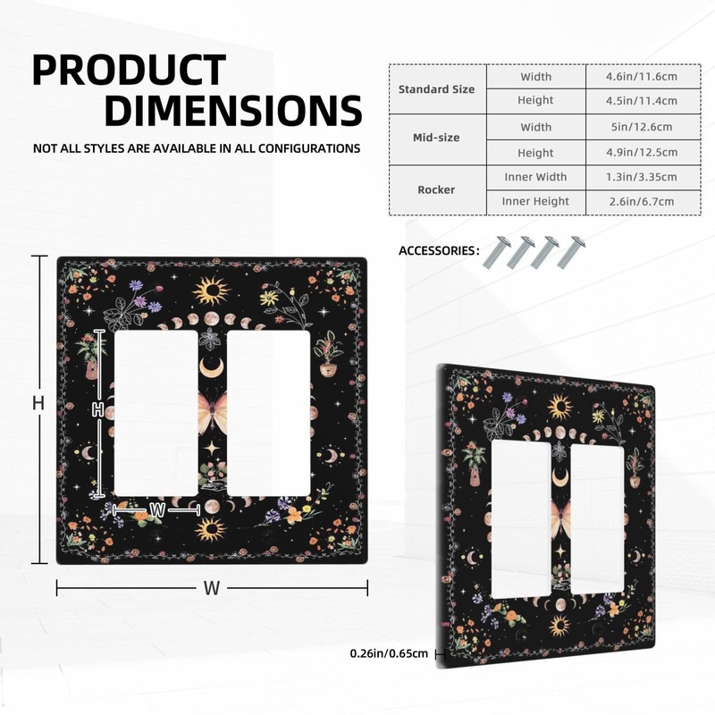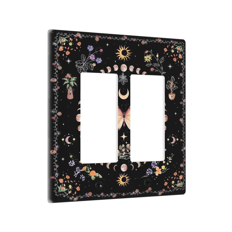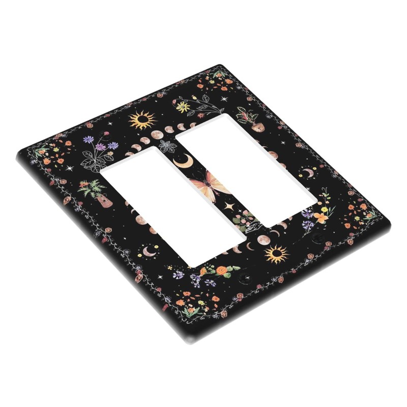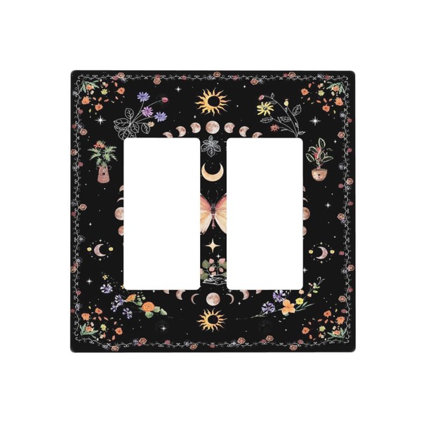 Gothic Hippy Boho Moth Moon Phase 2 Gang Double Rocker/GFCI Light Switch Cover Decorative Outlet Wall Plate Electrical Faceplate Home Bedroom Art Panel Decor Screwless