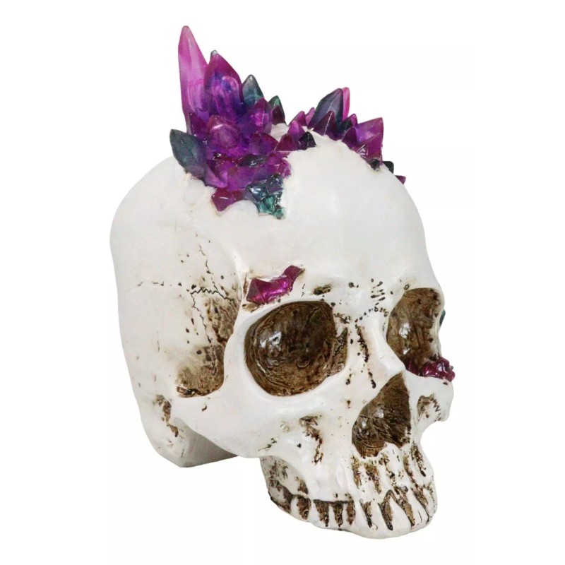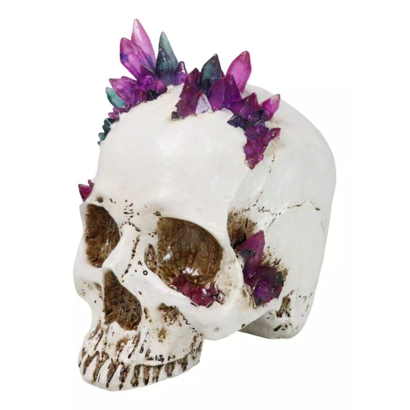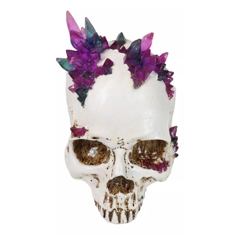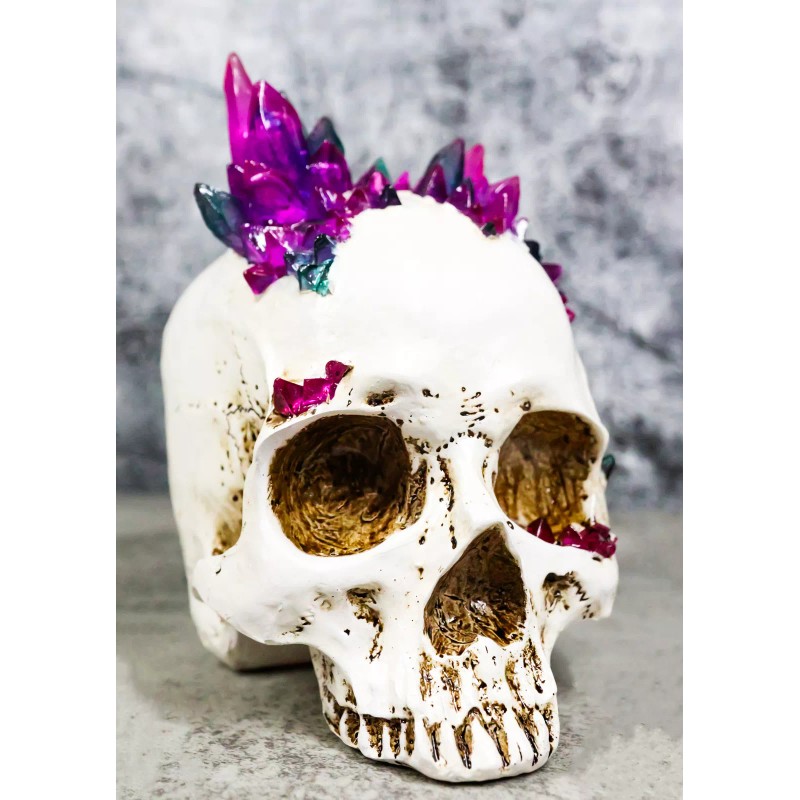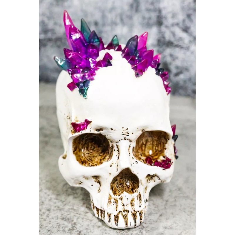 • Introducing the Crystal Cavern Mine Skull Figurine, a stunning and edgy addition to any macabre collection or decor. This striking piece merges the allure of crystals with the enigmatic symbolism of a skull, creating an eye-catching sculpture that will captivate anyone who sees it. What makes this skull piece truly unique is the array of spiky crystals emerging from its cranium.