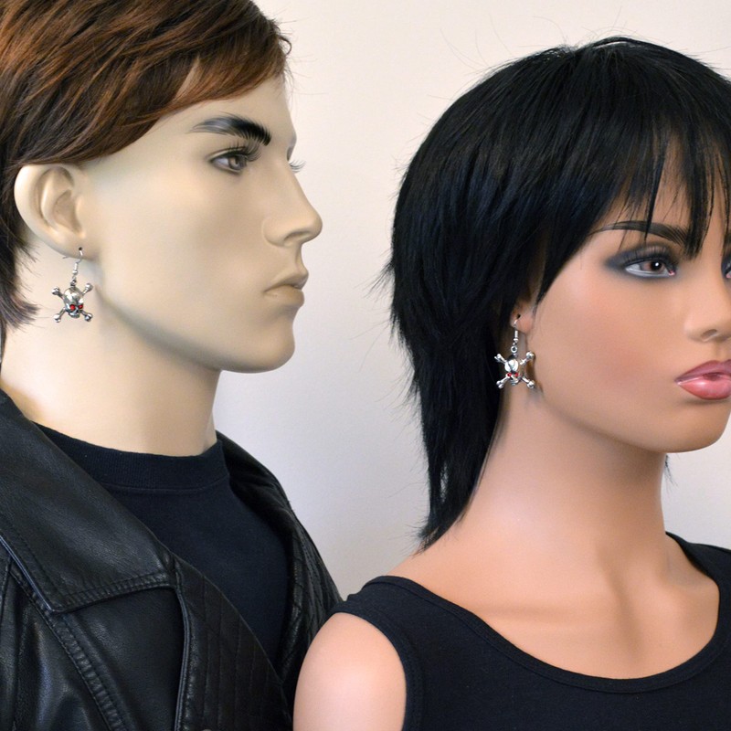 Gothic Skull and Crossbones Dangle Earrings with Red Austrian Crystal Eyes