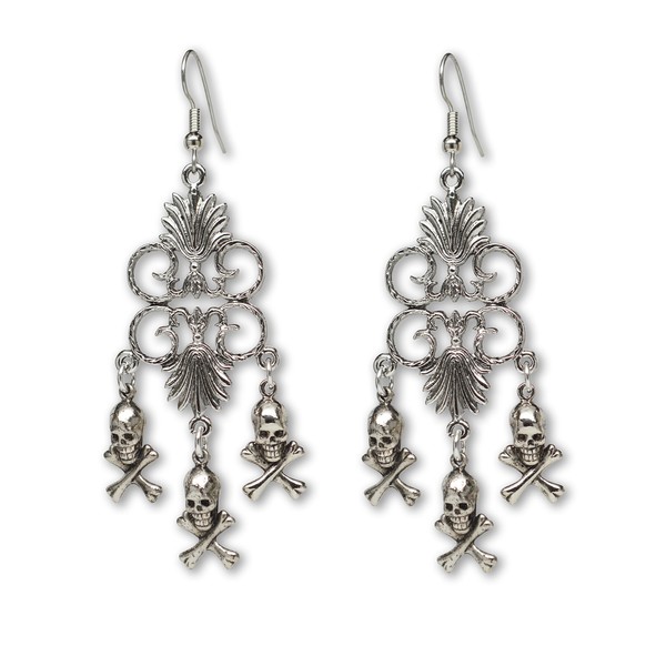 Gothic Skull and Crossbones Medieval Renaissance Chandelier Dangle Earrings Silver Finish