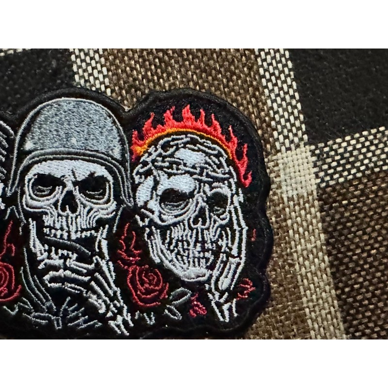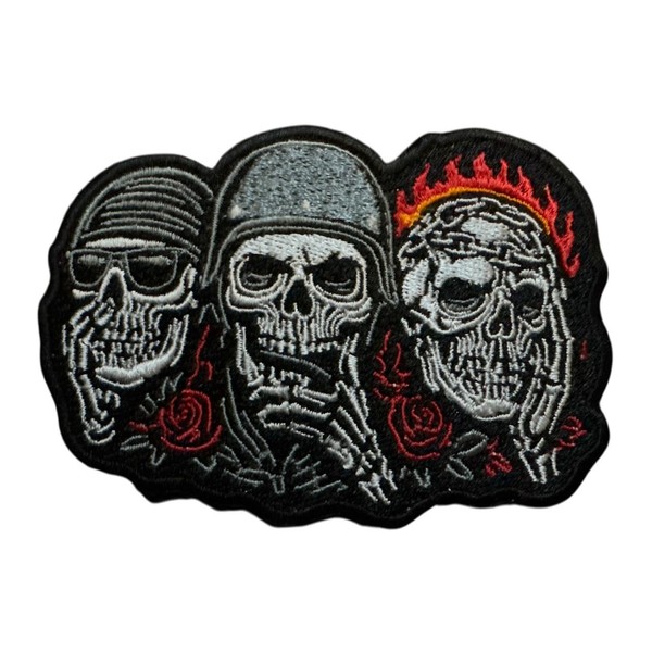 Gothic Skull Patch – Biker Rocker Style Embroidered Iron-On Applique | Edgy Skeleton Trio with Flames & Roses – Punk Jacket or Vest Decoration