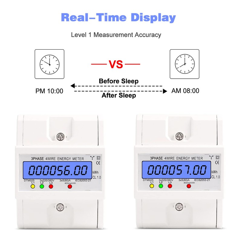 • Precise measurement: this power meter can display the status of the power supply (L1, L2, L3), pulse signal (400 impulse / kw/h, the pulse LED must flash the LEDs when working), 8-digit background lighting LCD, 6 + 2-digit display (999999.11 kWh), the data is accurate, smart meter. showshowed thththood Accuracy class: 1.