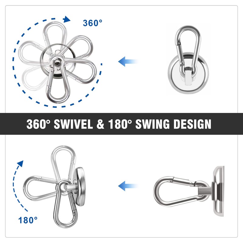 - Durable material: magnetic hook is made of neodymium magnet strong, metal cover, rotating parts and carabiner, compact structure, light weight, strong force, can be strongly attracted to iron, steel, nickel and other ferromagnetic materials.