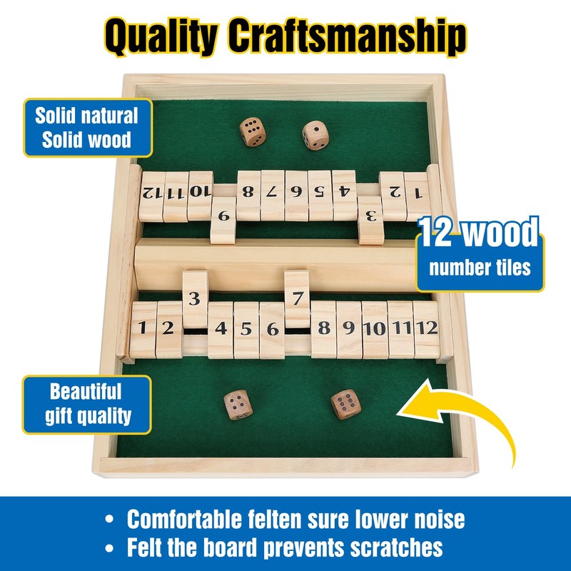 • STURDY AND WELL-MADEMade of rubber wood with a noise dampening felt mat inside, this shut the box game board measures 12'x10' and features 12 flip number blocks per side. This old-fashioned tabletop activity is a long-lasting game that the whole family will enjoy playing it for many years to come!