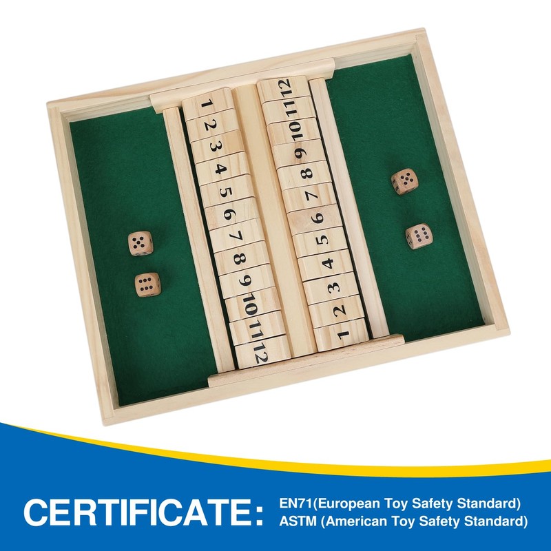 • SAFE AND DURABLEThis Shut the box is made from superior pine wood, which is tough and dense, well-constructed and feels smooth. The wood is certified by the Forest Stewardship Council (FSC) and meets universal sustainability standards. All the materials pass the toy safe test of EN71 (European Toy Safety Standard) and ASTM (American Toy Safety Standard).