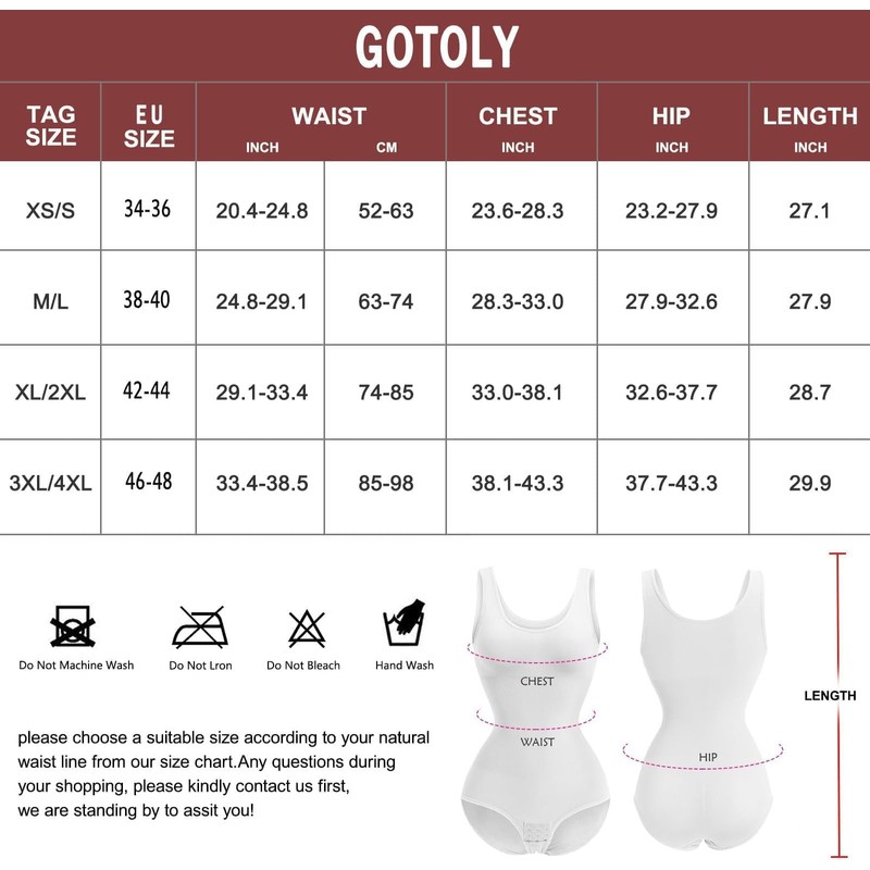 - Slim fit bodysuits with easy control. Unlike conventional bodysuits, the GOTOLY women's slimming bodysuits are made from a body-hugging, elastic and seamless soft fabric that emphasises the curve and flatters your figure. The slim slimming shaping jumpsuit abdominal control has a practical adjustable hook in the crotch that makes it easier to put on and take off and goes comfortably to the toilet.