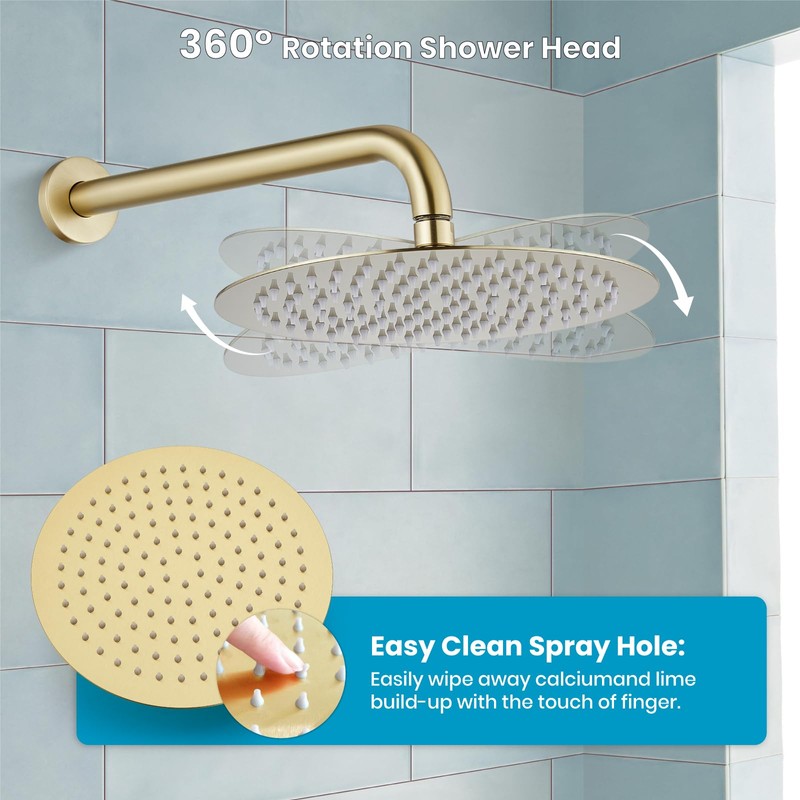 This wall mount shower combo set is premium brass construction, brushed gold finish to resist corrosion and anti-rust. 10 inch round shower head offers a good shower experience.