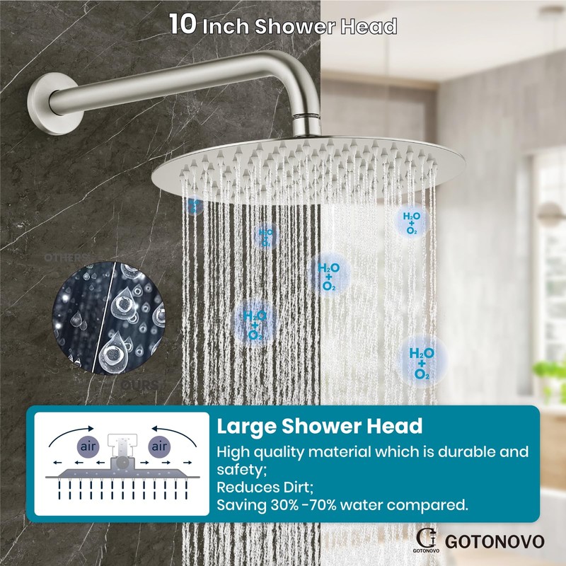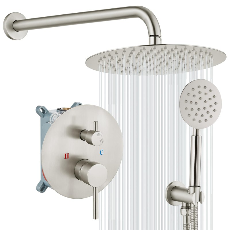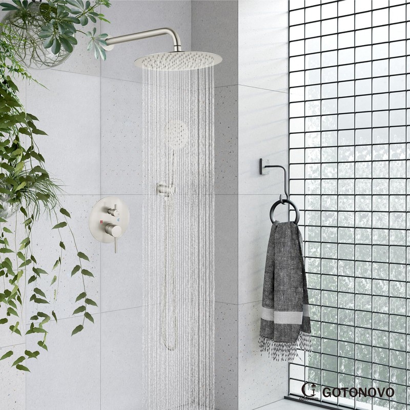 gotonovo 10 Inch Round Rain Shower System Wall Mounted Bathroom Mixer Combo Set High Pressure Shower Head with Rough in Valve Round Handheld Brushed Nickel