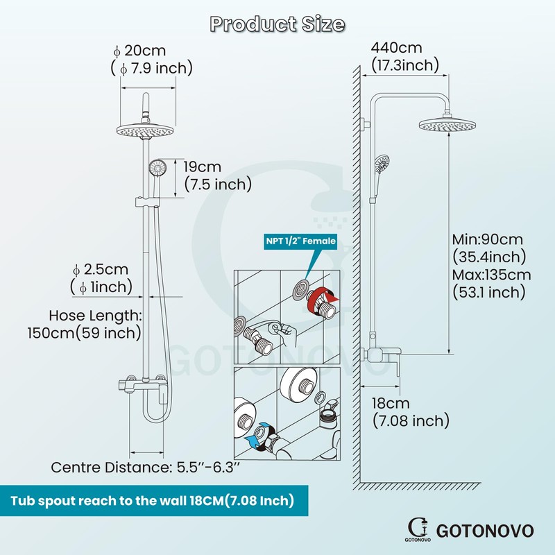 - Adjustable Hole Distance:The hole center distance on the wall is 5.9 inch(15cm). Come with NPT 1/2 adapter to adjust installation hole distance between 5.1 inch to 6.4 inch(13cm-16.5cm).
